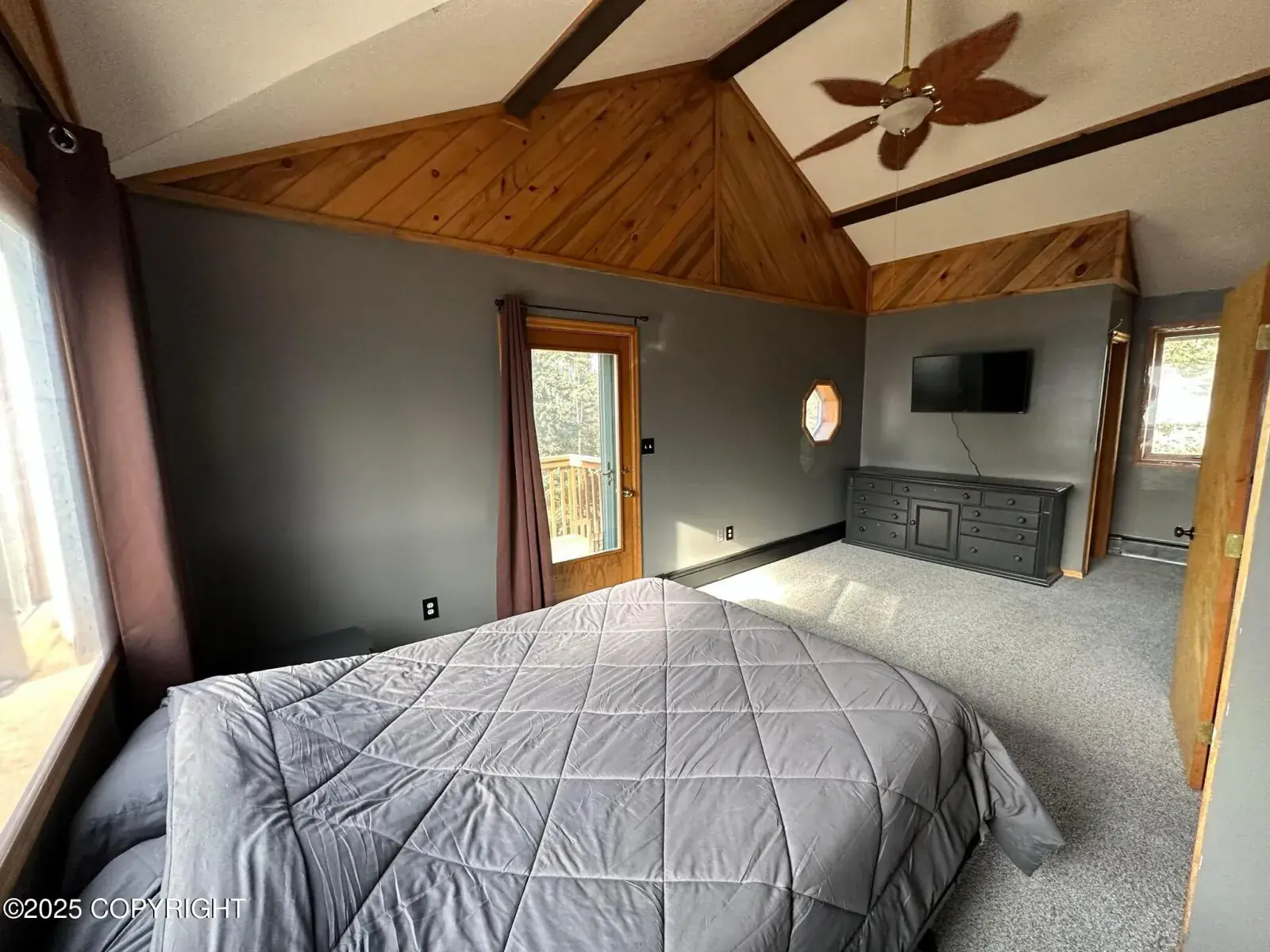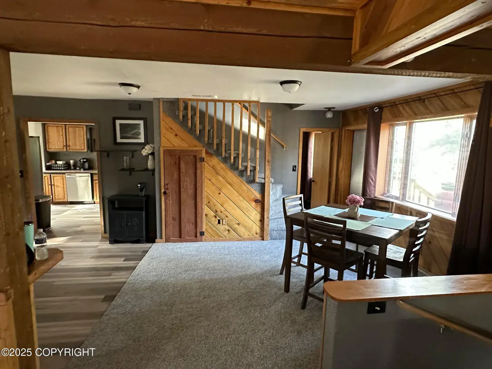2 bedrooms, 1 full bath upper floor w/balcony from 1 bedroom, other bedroom has bonus loft area. Main floor has 1 bed, kitchen w/breakfast nook, w/i pantry, dining area w/access to wrap deck, living room w/wood stove, bay window & vaulted ceiling. Large detached 2 car garage, greenhouse, 3-sided horse barn w/corral. Newer paint, flooring, countertop, septic. Ready to move in. No property taxes