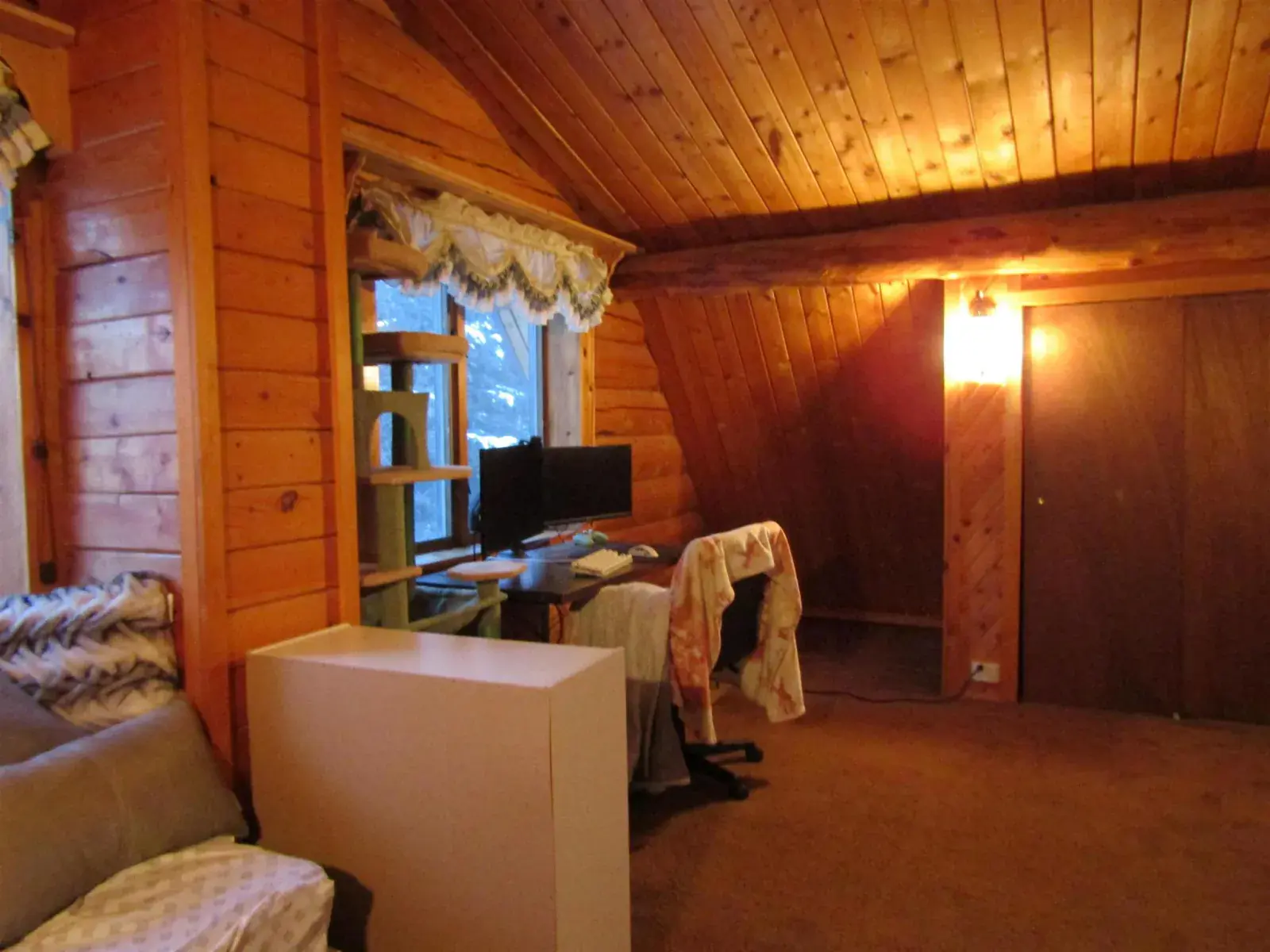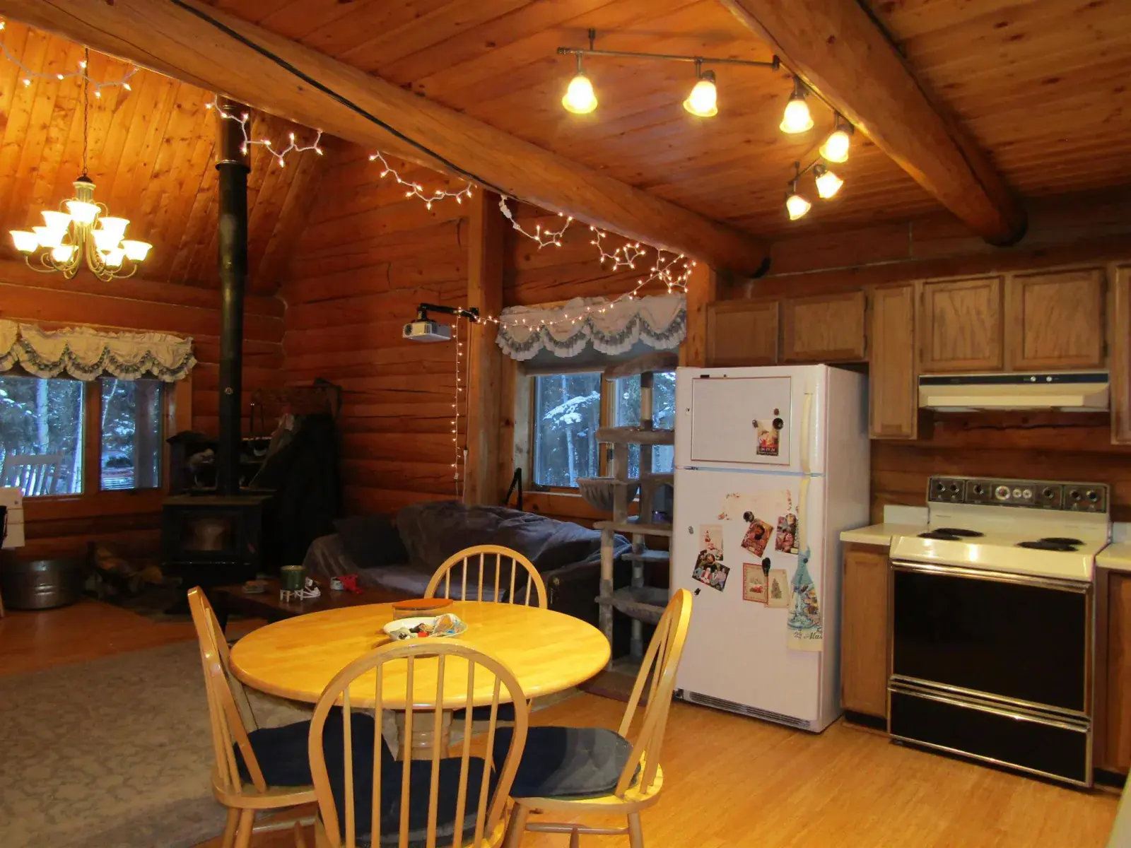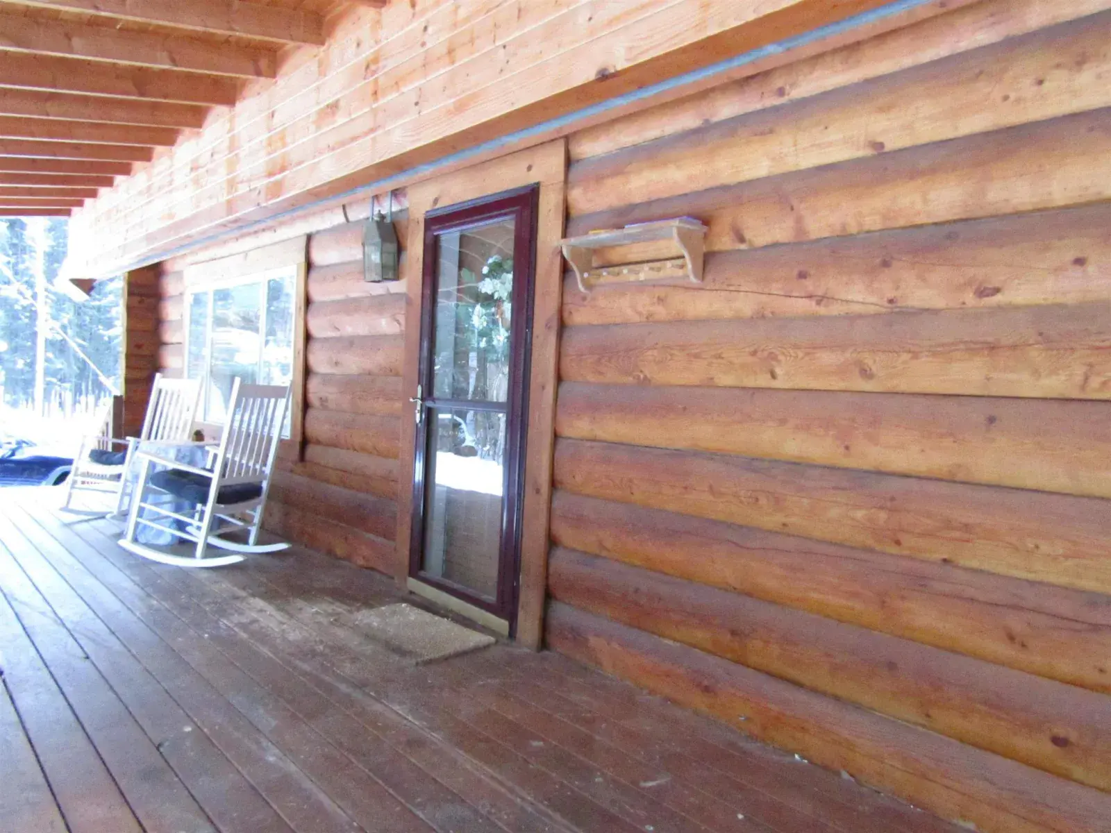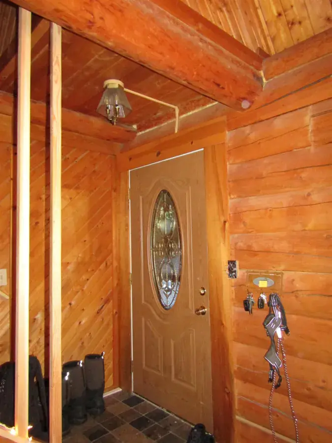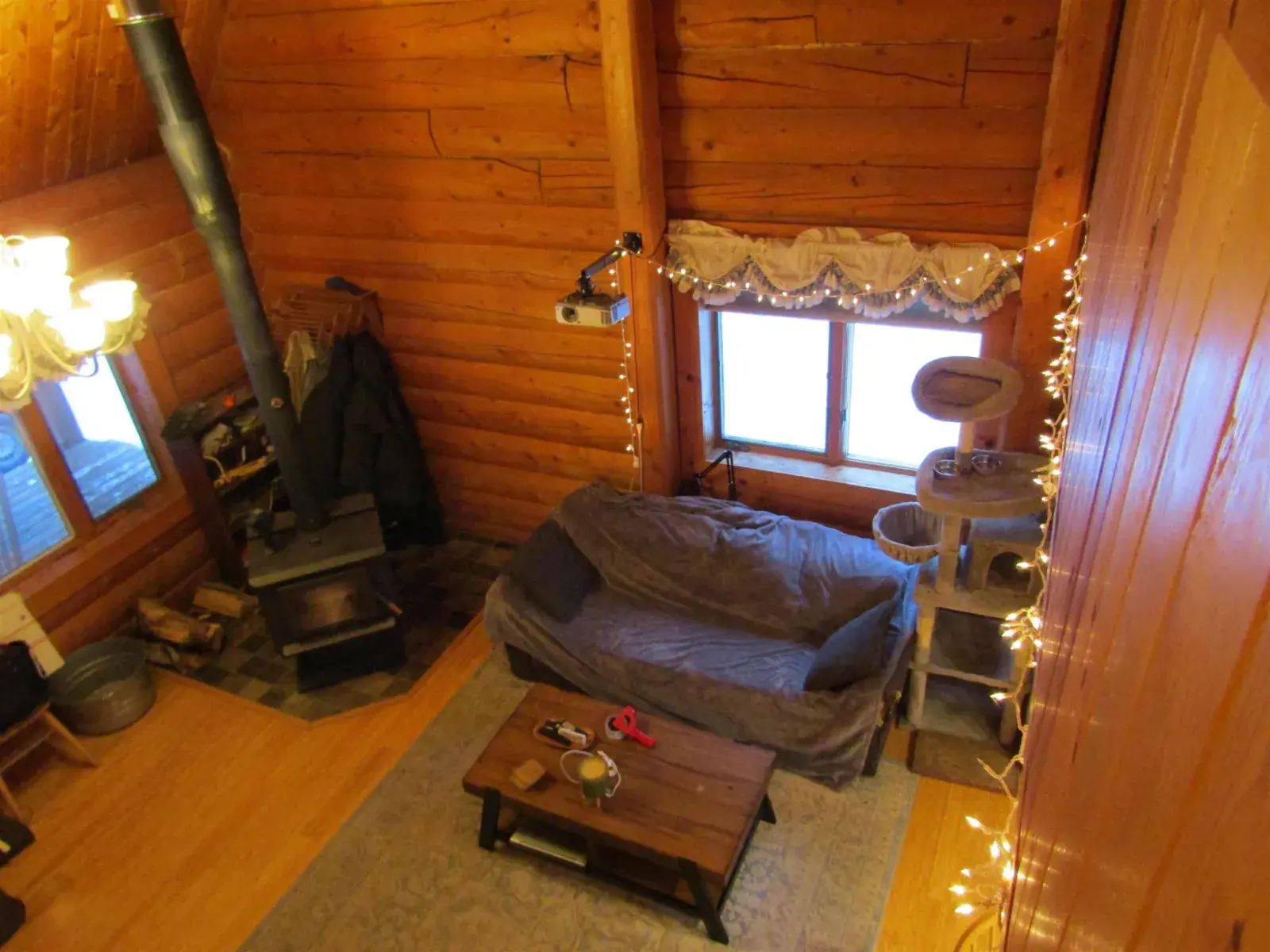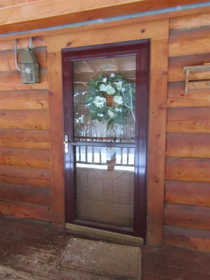 This charming log home features a fully covered front porch—an ideal spot to enjoy sunny summer afternoons. Out back, the deck overlooks a spacious backyard and greenhouse, offering both privacy and versatility. Inside, the living area boasts a vaulted ceiling and an open layout that flows seamlessly into the dining area and kitchen. The main floor includes a bedroom and full bathroom, while the upper level offers a second bedroom and a generously sized open area perfect for a home office, extra sleeping space, or whatever suits your needs. The full, open basement includes a half bath and is ready to be easily finished. A forced-air furnace provides ample heat, or can serve as backup if you prefer heating with the Blaze King wood stove—adding both efficiency and the cozy ambiance everyone loves.