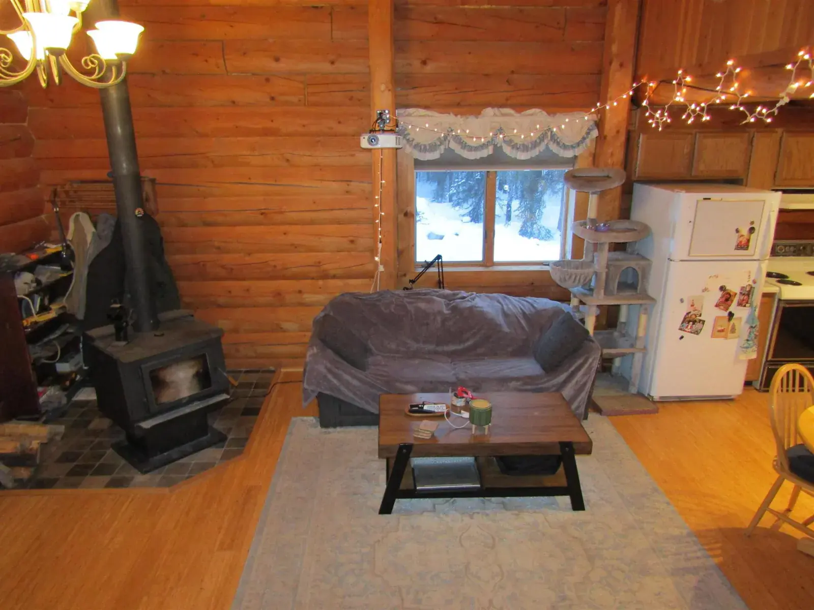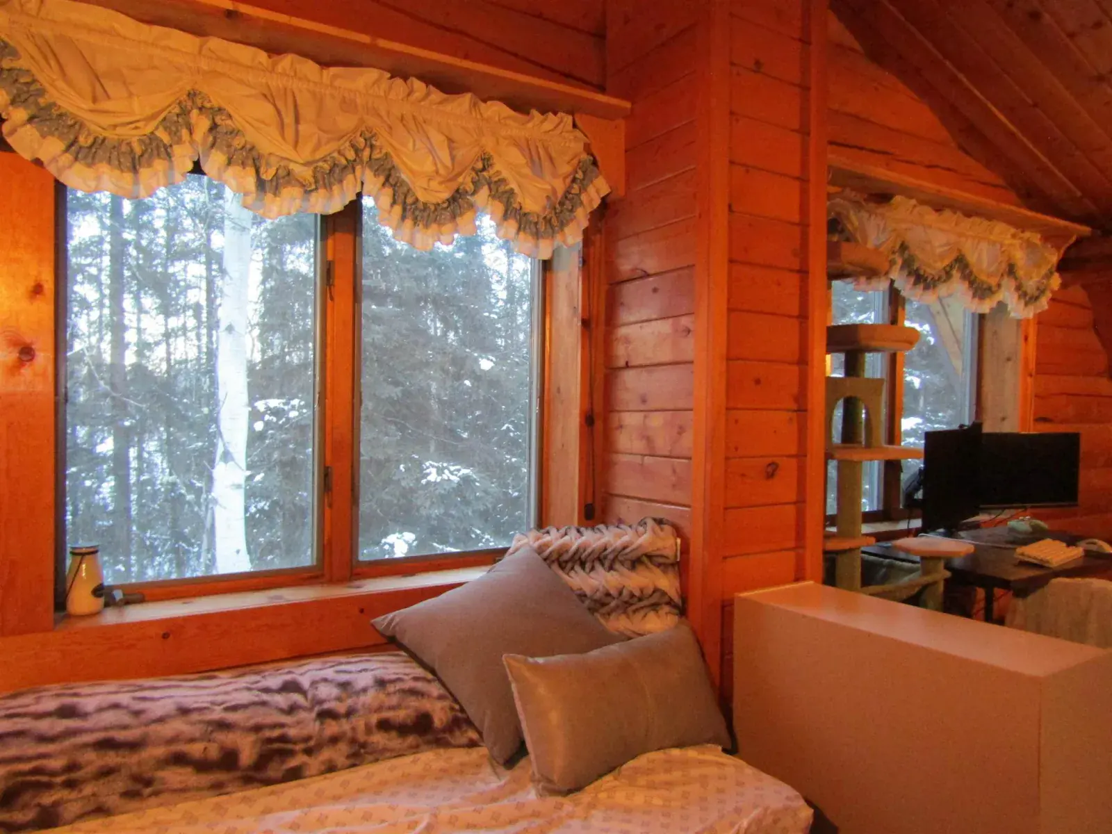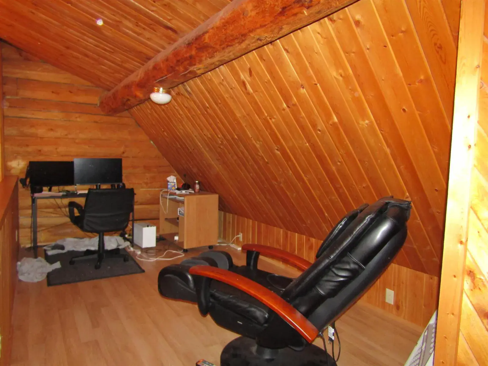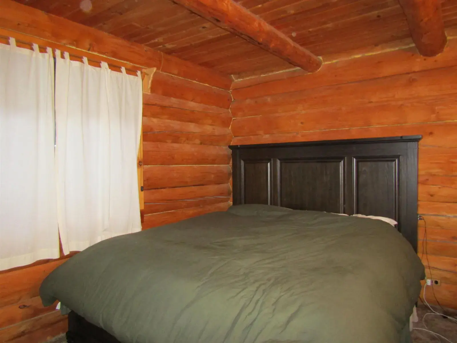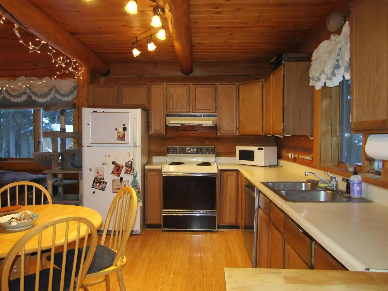 This charming log home features a fully covered front porch—an ideal spot to enjoy sunny summer afternoons. Out back, the deck overlooks a spacious backyard and greenhouse, offering both privacy and versatility. Inside, the living area boasts a vaulted ceiling and an open layout that flows seamlessly into the dining area and kitchen. The main floor includes a bedroom and full bathroom, while the upper level offers a second bedroom and a generously sized open area perfect for a home office, extra sleeping space, or whatever suits your needs. The full, open basement includes a half bath and is ready to be easily finished. A forced-air furnace provides ample heat, or can serve as backup if you prefer heating with the Blaze King wood stove—adding both efficiency and the cozy ambiance everyone loves.