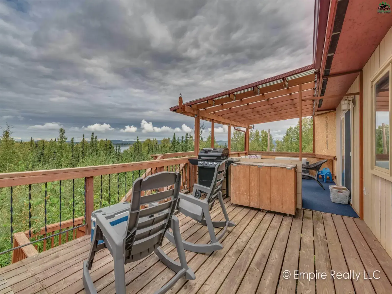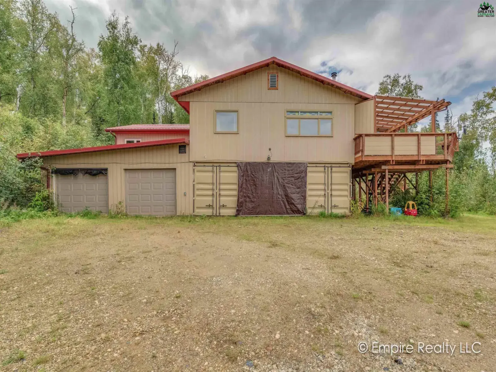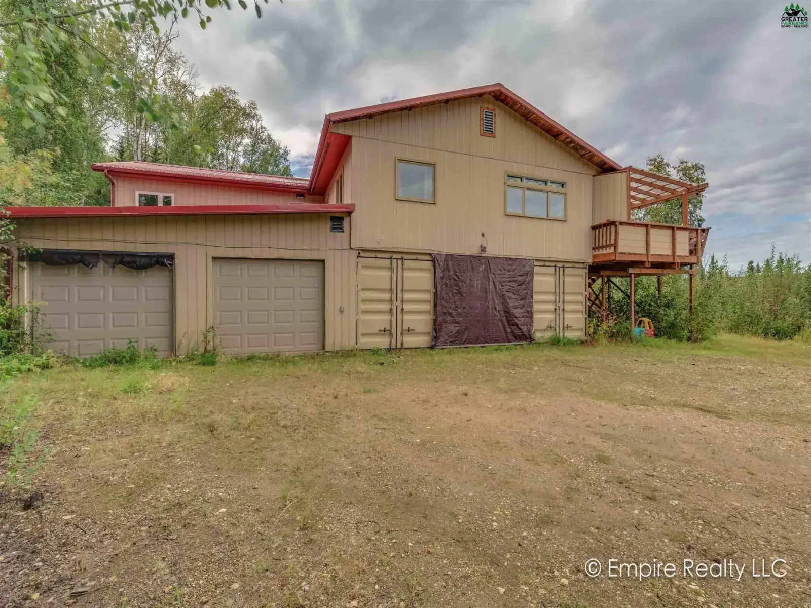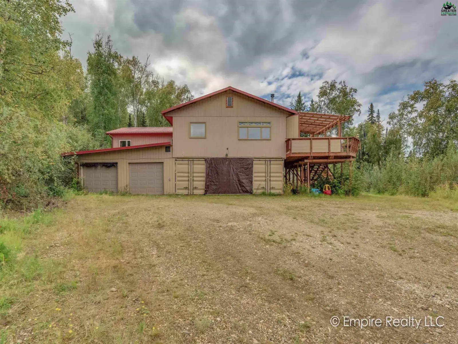 It is hard to beat a year round home with a view of Harding Lake for interior Alaska living! This three bed, one bath, two car garage home is just waiting for new owners. Enjoy the open and comfortable kitchen, dining and living area while you snuggle around the wood stove or during our beautiful summer days retire to the absolutely enormous deck for dinner and conversation with friends. The property offers a ton of storage – take your pick of either of two connex storage containers (one with electricity) or the dry storage in between. Of course, the garage is oversized for two cars anyway so there is more room to store there, too. The largest bedroom is removed from the others and has private access to a screened in portion of the deck. The house has been used an a bnb in the past and the furnishing are negotiable.