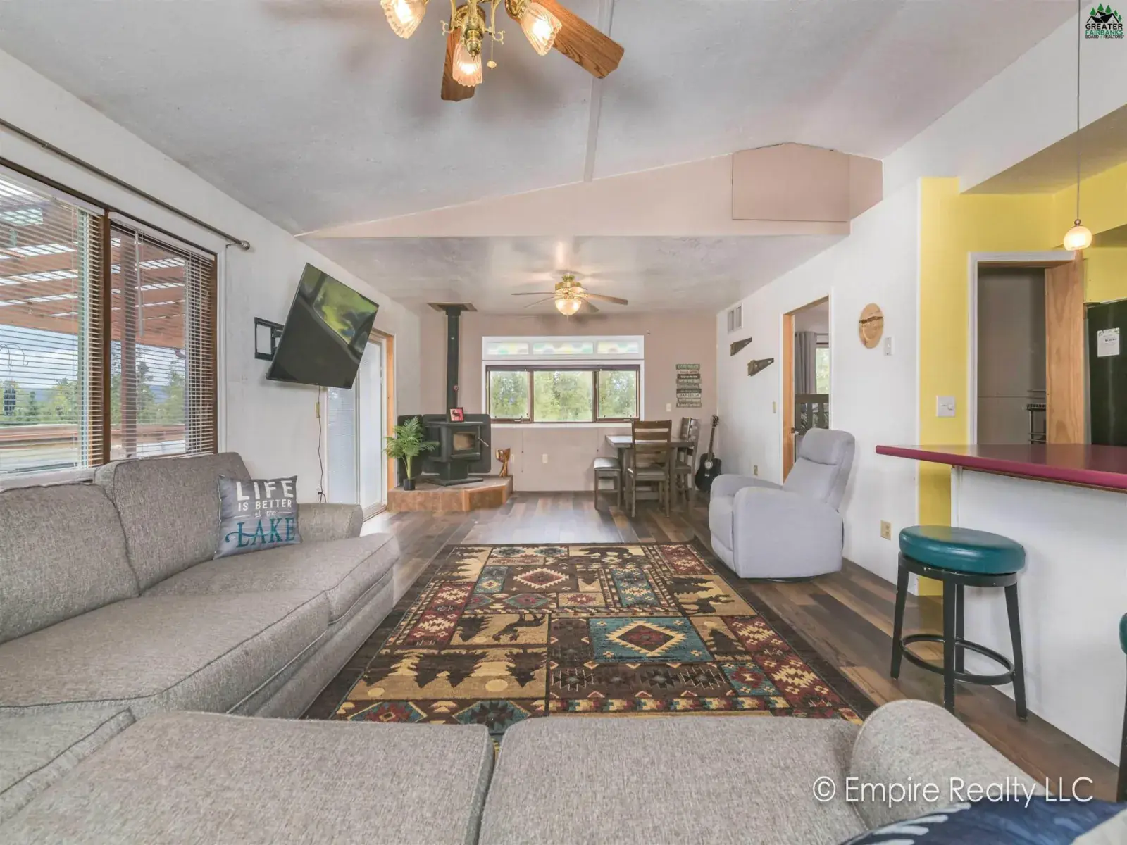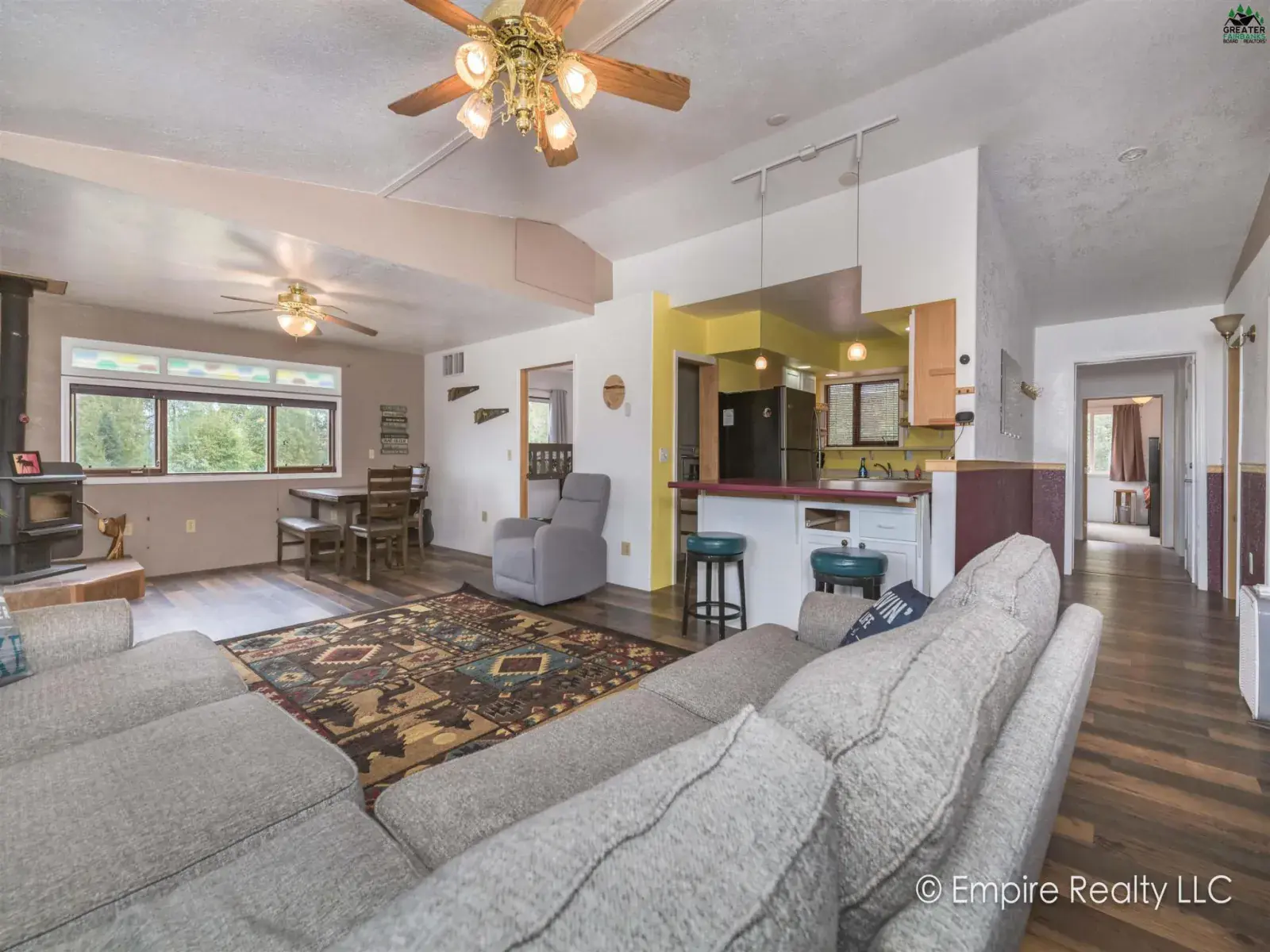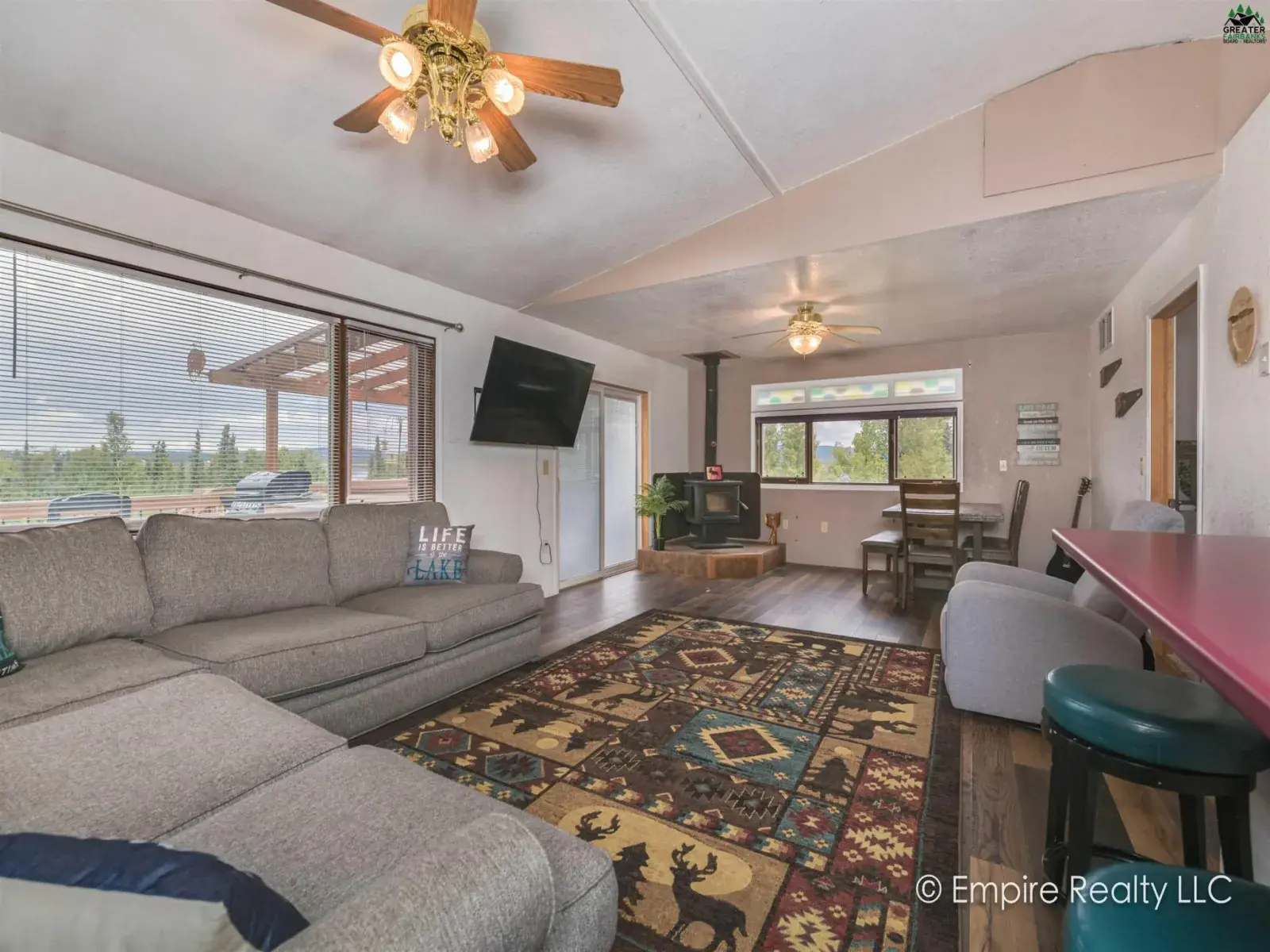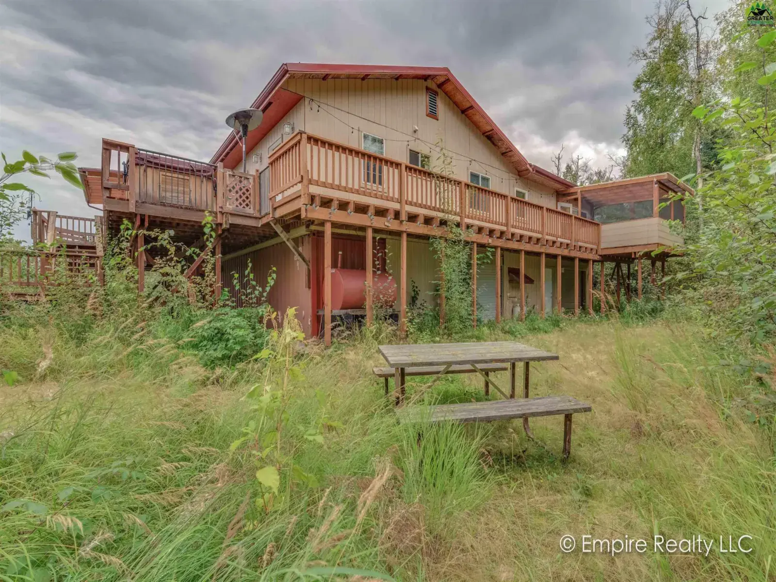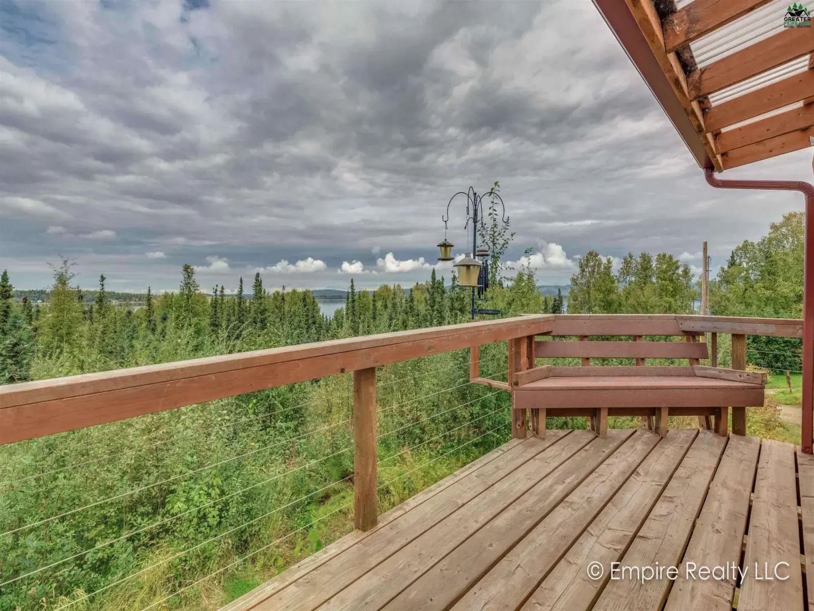 It is hard to beat a year round home with a view of Harding Lake for interior Alaska living! This three bed, one bath, two car garage home is just waiting for new owners. Enjoy the open and comfortable kitchen, dining and living area while you snuggle around the wood stove or during our beautiful summer days retire to the absolutely enormous deck for dinner and conversation with friends. The property offers a ton of storage – take your pick of either of two connex storage containers (one with electricity) or the dry storage in between. Of course, the garage is oversized for two cars anyway so there is more room to store there, too. The largest bedroom is removed from the others and has private access to a screened in portion of the deck. The house has been used an a bnb in the past and the furnishing are negotiable.