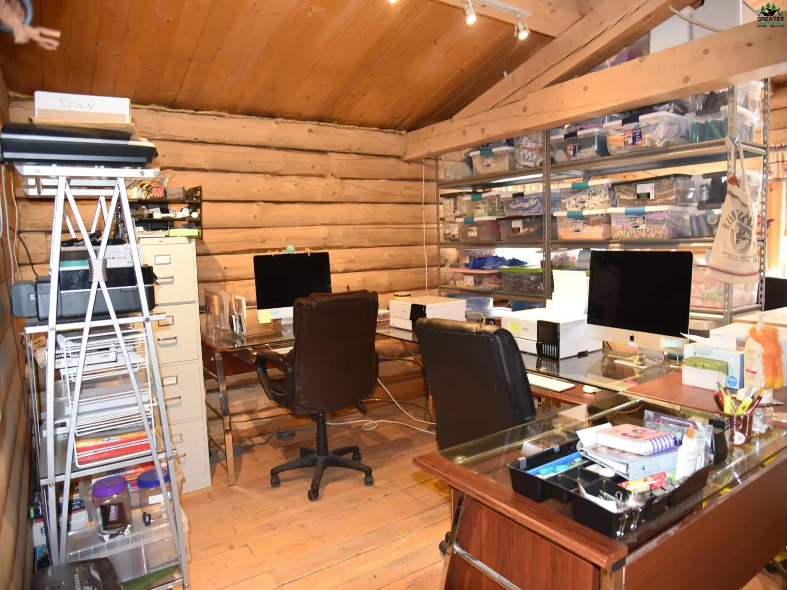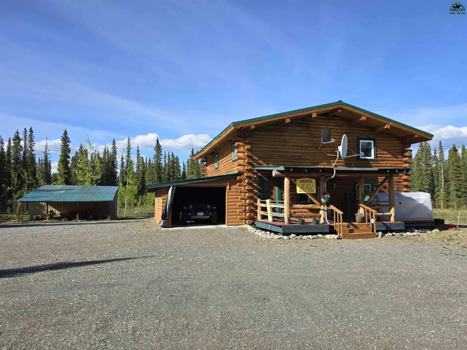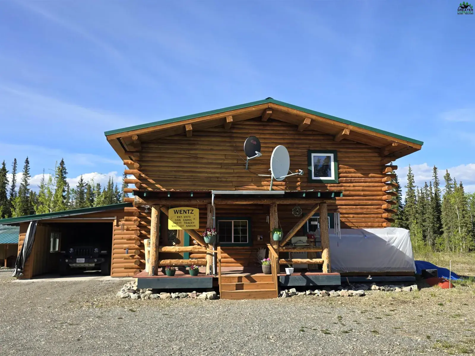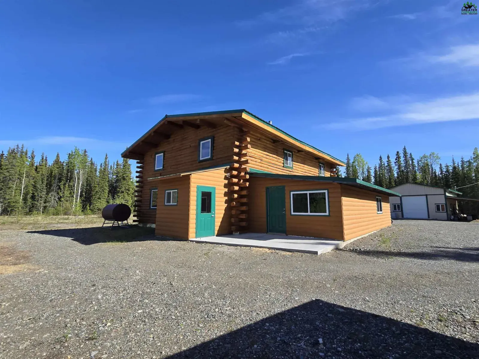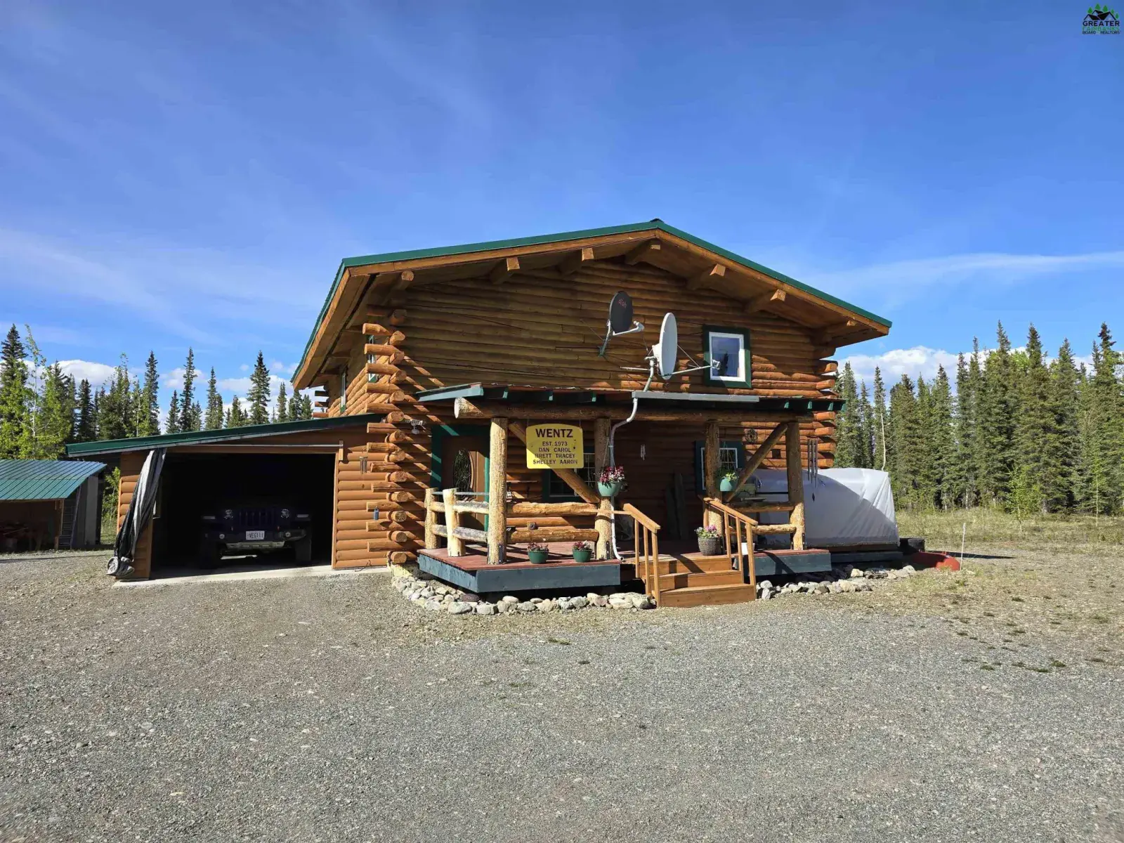 Spacious 2-story log home on 6+ acres in Tok, Alaska, designed for comfort with a cozy, rustic charm. The first floor features a country kitchen, dining area, and a living room with a Blaze King woodstove, along with a large bedroom. Upstairs, you’ll find three bedrooms, including a master suite currently used as a craft and sewing room, a practical office, and a central landing that serves as a flexible space for activities, connecting all the rooms. The property includes a detached garage, heated workshop, an open shed suitable for RV storage or building materials, and a woodshed that holds up to 14 cords. Experience the perfect blend of space and warmth in this inviting home.