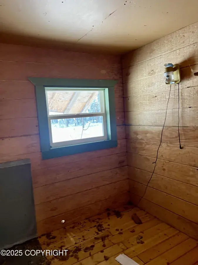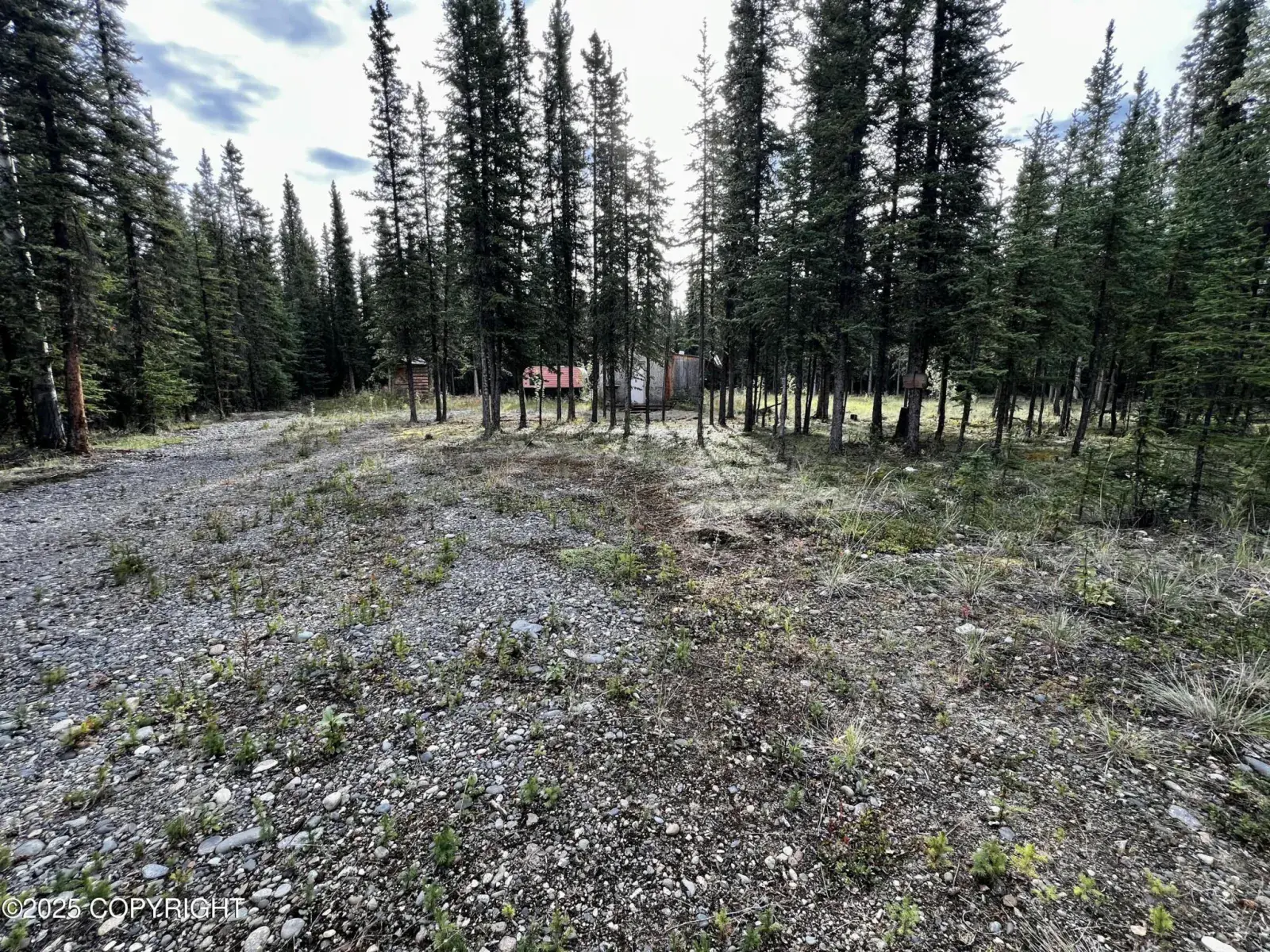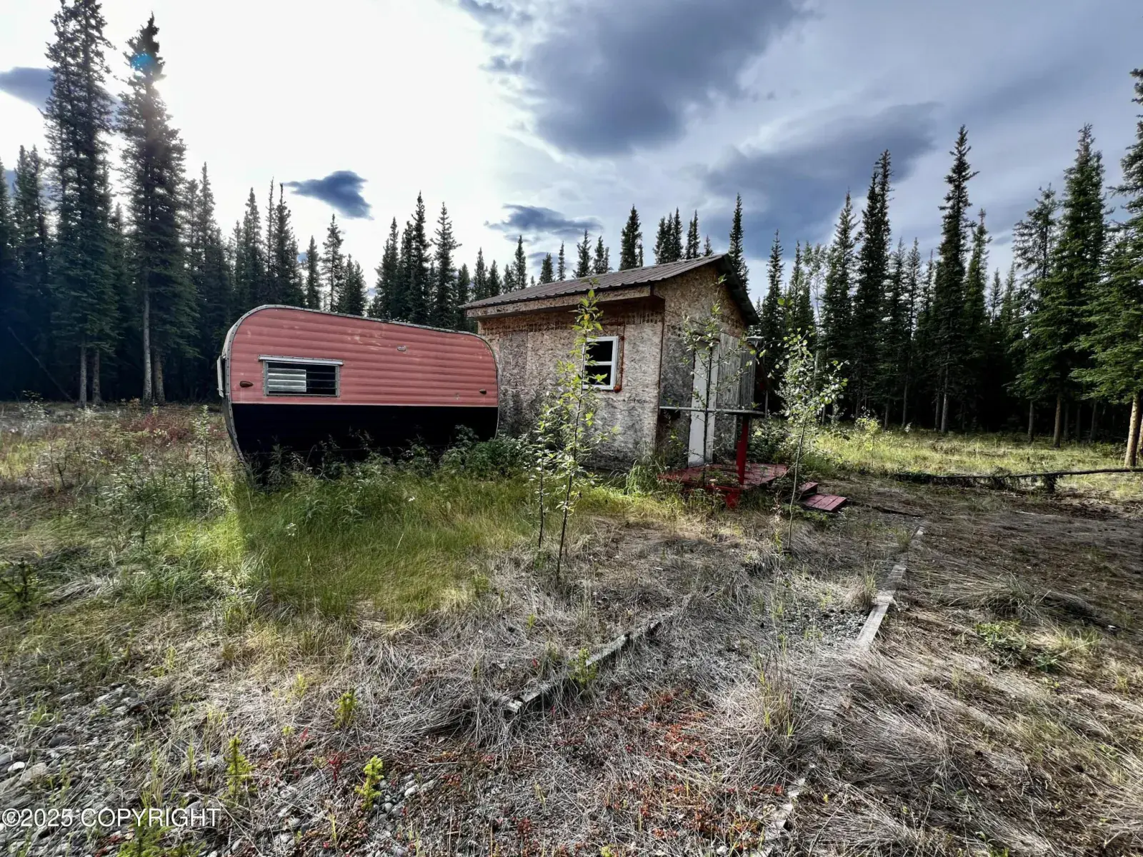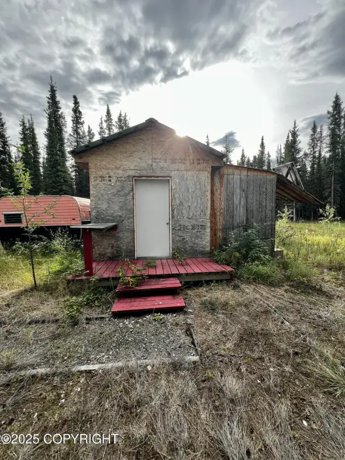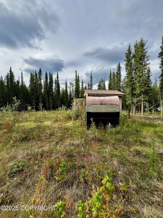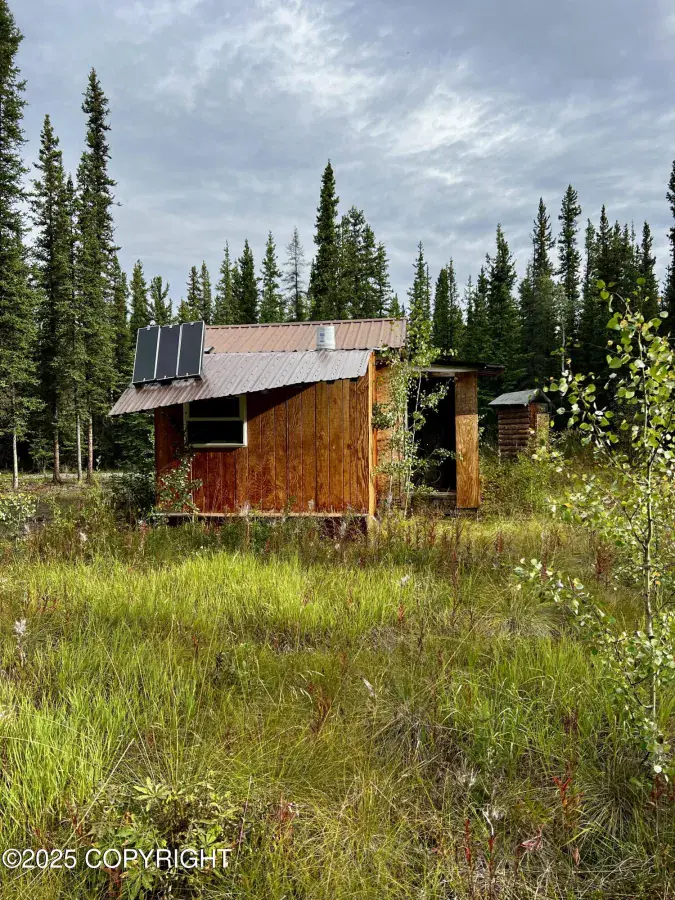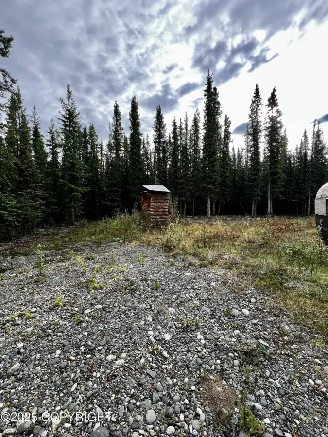 1.262-acre lot featuring a small cabin, mobile trailer, and outhouse. Power is nearby, located across the street and one lot over.