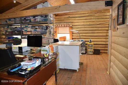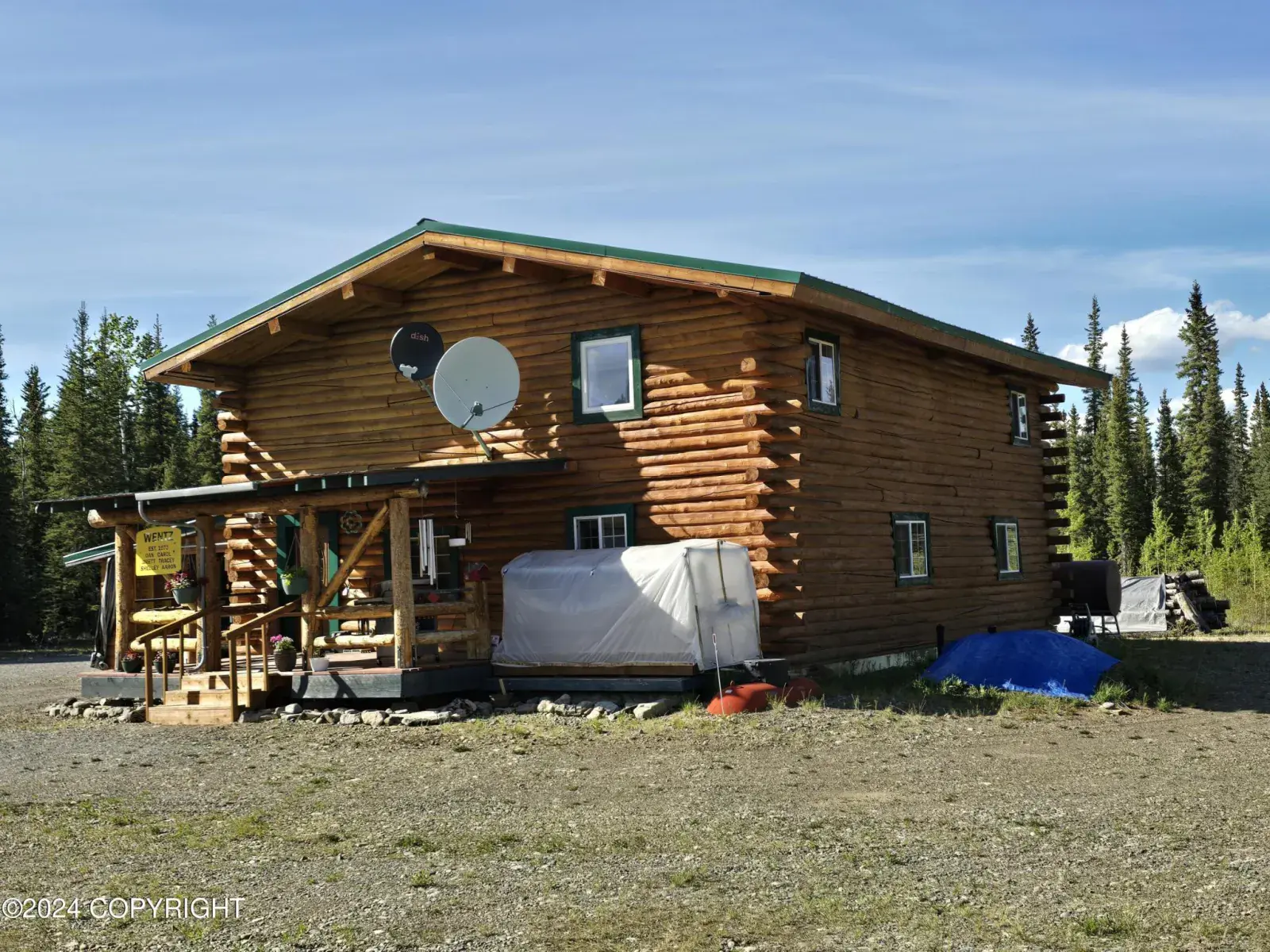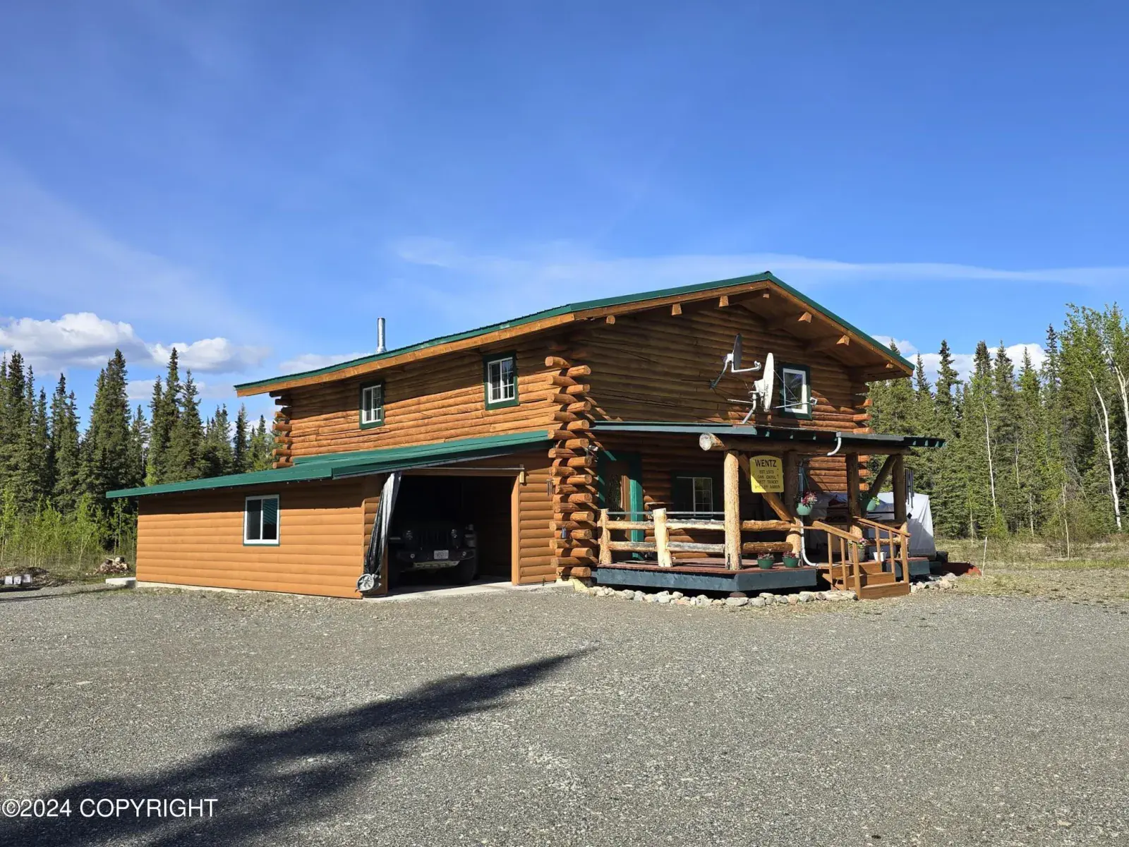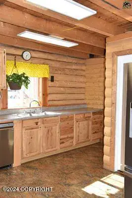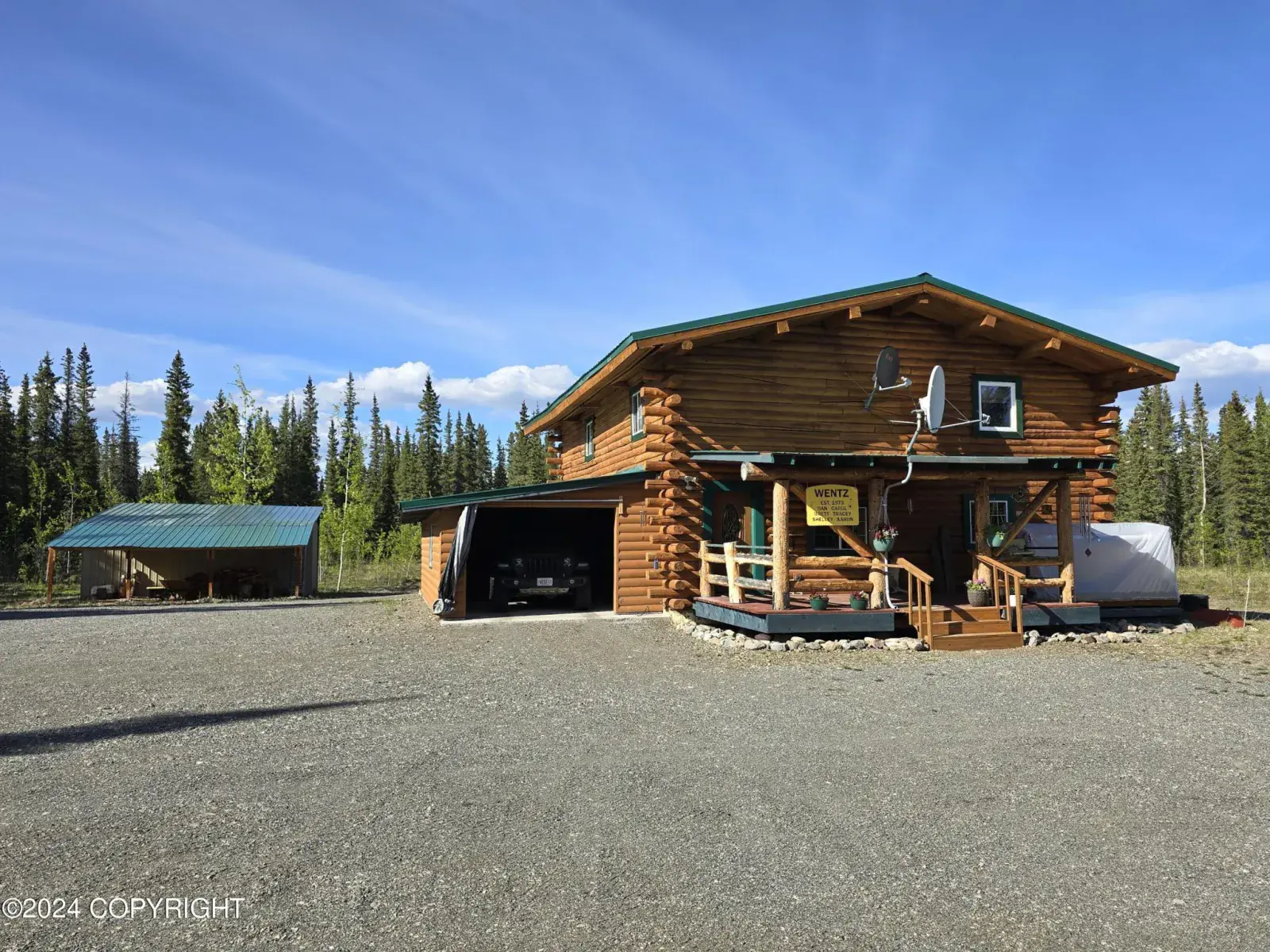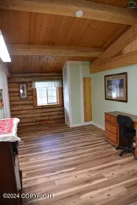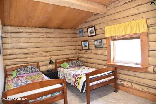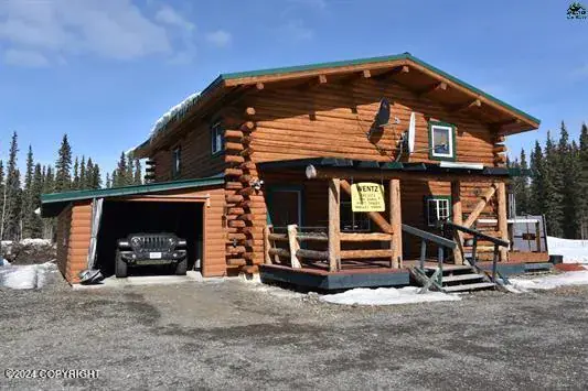 Spacious 2-story log home on 6+ acres in Tok, Alaska, designed for comfort with a cozy, rustic charm. The first floor features a country kitchen, dining area, and a living room with a Blaze King woodstove, along with a large bedroom. Upstairs, you’ll find three bedrooms, including a master suite currently used as a craft and sewing room, a practical office.There is a spacious central landing upstairs that serves as a flexible space for activities, connecting all the rooms. The property includes a detached garage, heated workshop, an open shed suitable for RV storage or building materials, and a woodshed that holds up to 14 cords. Many recent upgrades from 2022 – 2024: